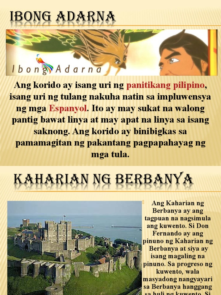 May labing dalawa 12 na pantig sa bawat taludtod Tulang pasalaysay na kung saan makatotohanan ang mga tauhan at maaring maganap sa tunay na buhay ang kanilang. Pangalawa nang pakawalan nila ang Ibong Adarna na naging dahilan ng. Pamamagitan ng pagputol ni Don Pedro sa lubid.